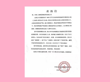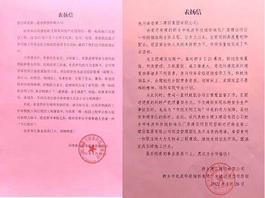 新鄉建工建設有限公司和河南新飛智家科技有限公司向河南二建集團鋼結構有限公司發來表揚信