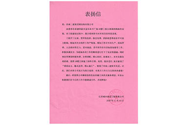 中鐵四局集團第一工程有限公司向河南二建集團鋼結構有限公司發來表揚信