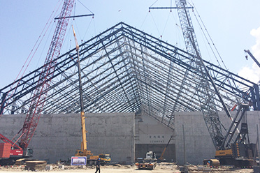 寧波臺塑電廠室內煤場鋼桁架屋架工程跨度為81.2米,長度為135米。